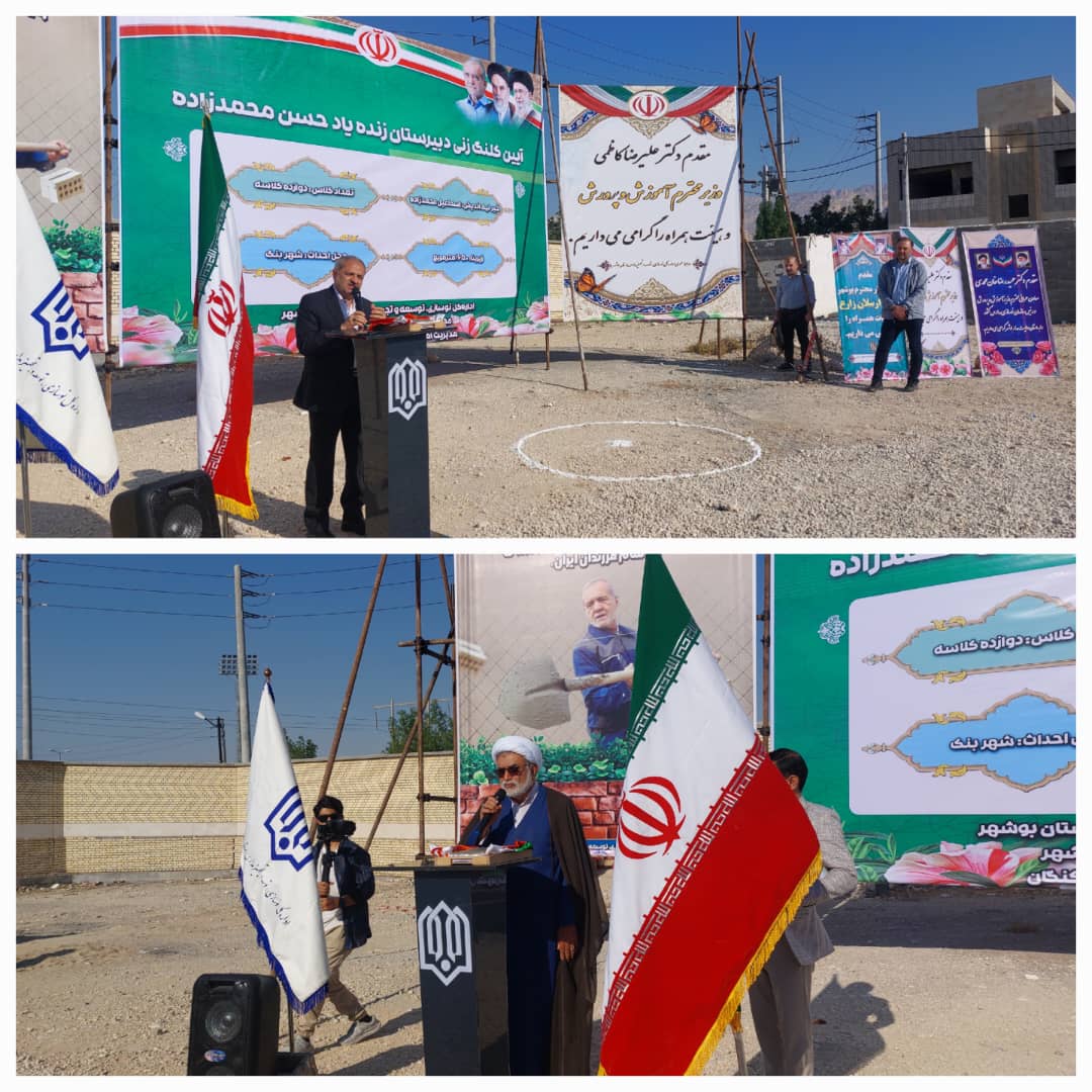 به گزارش روابط‌عمومی فرمانداری شهرستان کنگان، آیین کلنگ‌زنی دبیرستان ۱۲ کلاسه «زنده‌یاد حسن محمدزاده» با حضور وزیر آموزش‌وپرورش و هیئت همراه، رئیس سازمان نوسازی، توسعه و تجهیز مدارس کشور، استاندار بوشهر، نماینده مردم در مجلس شورای اسلامی، فرماندار کنگان، امام جمعه، مسئولان استانی و محلی و خیر نیک‌اندیش، اسماعیل محمدزاده ـ بانی احداث این واحد آموزشی ـ در شهر بنک برگزار شد.