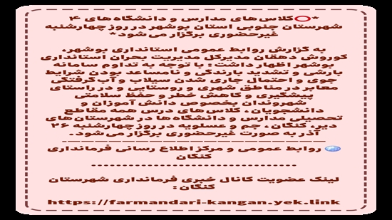 کلاسهای مدارس و دانشگاههای ۴ شهرستان جنوبی استان بوشهر در روز چهارشنبه غیرحضوری برگزار میشود